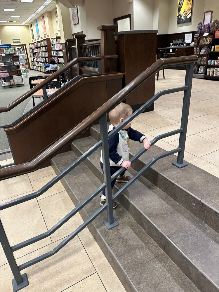 After a long midday nap, I often took Misha out to a place where he could run. Our first day out, once the snowy Ohio roads were melted enough not to scare me, I took Misha to a Barnes & Noble. I was longing for a place that looked familiar and wanted to buy Misha some books that I enjoyed reading to my kids, like Hop Toad, Go Dogs Go, and Hand Hand Fingers Thumb. It was a huge store, so I spent a good two hours playing follow the leader. Misha found the three steps going up to the in-store Starbucks and went up and down about five thousand times. What a special way to get those elevated steps in. My phone congratulated me later. The most exciting place in the store was the handicap ramp up to said Starbucks. We ran down the ramp with abandon. Misha always beat me. He would race around the corner, and when I came around, he would pose like he was heading out into the store and then laugh and turn around and run past me up the ramp again. About ten minutes in, I wished that I had started counting. When I got tired, I boosted my confidence with thoughts like the following: